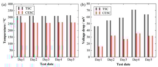 Industrial-scale test data for temperature (a) and voltage drop (b) of steel claw.