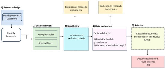 This study conducts a comparative analysis to identify the types and concentrations of pesticides detected in the waters of different rivers around the world. The aim is to identify the rivers with the highest pesticide levels to highlight both the environmental and health impacts of pesticide use. The selection process was performed through five steps: (1) research design, (2) data collection, (3) inclusion and exclusion criteria, (4) data evaluation, and (5) selection. Figure 1 shows the document selection process.