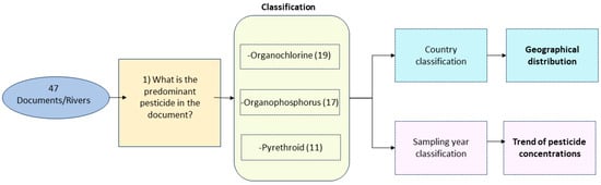 The 47 rivers were categorized based on the type of pesticides detected: organochlorine (19), organophosphorus (17), and pyrethroid compounds (1). Each river was classified according to the predominant type of pesticide reported, as shown in Figure 2. If multiple pesticide types were equally predominant, classification was based on the pesticide with the highest concentration. From these tables, rivers were also categorized by country, and consequently, by geographical distribution. Finally, rivers were grouped by sampling year to facilitate the analysis of trends in pesticide concentrations.