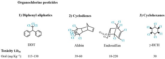 Organochlorine pesticides (OCPs) are mainly composed of chlorine, hydrogen, and carbon. For several decades, OCPs have been employed to control pests in agriculture and for vector control in humans [67]. Despite their utility, they are one of the most toxic and hazardous persistent organic pollutants (POPs) and present a serious risk to the environment due to their long-range environmental transport ability and bioaccumulation potential [68]. However, the effects of OCPs on the environment depend on their concentration, dosage, and persistence [69]. OCPs are lipophilic compounds that can adhere to the fatty tissues of mammals and accumulate in water, sediments, soil, and plants [67]. Despite the ban imposed on their use, OCPs continue to be detected at considerable levels across different regions worldwide [70]. OCPs can be divided into three main groups [71]: (1) diphenyl aliphatics (e.g., DDT (dichlorodiphenyltrichloroethane) and DDD (dichlorodiphenyldichloroethane)), (2) cyclodienes (e.g., endosulfan, heptachlor, aldrin, dieldrin, and endrin) and (3) cyclohexanes (e.g., α-, β-, γ-, δ-HCH (hexachlorocyclohexane)). Figure 3 shows the chemical structures of some OCPs and their lethal dose (LD50) values [72,73].