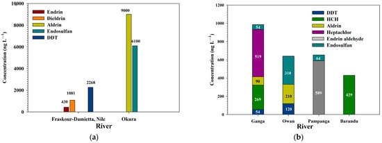 Other types of organochlorine compounds with irreversible environmental impacts have been reported in rivers worldwide, as shown in Figure 4b. The Ganga and Pampanga Rivers present high concentration values of heptachlor (519 ng L−1) and endrin aldehyde (589 ng L−1), respectively [77,83]. Additionally, the Owan River in Nigeria and the Barandu River in Pakistan show values of 380 for α-BHC and 429 ng L−1 for Ʃ-HCH, respectively [78,92].
