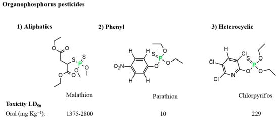 Organophosphorus pesticides (OPPs) are derivates of phosphoric, phosphonic, thiophosphoric, or phosphinic acids [97,98,99]. They are globally recognized as the most extensively used class of pesticides due to their low cost, simple synthesis, and high efficacy [100,101]. OPPs have been used extensively after the ban on OCPs [97]. With over 100 different types, OPPs constitute one of the largest groups of pesticides and represent almost 34% of the pesticides produced and sold for agricultural purposes [102,103,104]. In developing countries, OPPs have become indispensable for supporting economies that depend on agriculture [97]. However, their widespread use has raised environmental concerns. According to Farkhondeh et al. [105], OPPs represent a serious environmental pollutant. These pesticides reduce water quality due to their high persistence, lipophilicity, environmental accumulation, and potential for long-range transference [96]. OPPs can be classified into three main groups based on their chemical structure: (1) aliphatic (e.g., dimethoate, dichlorvos, malathion, and omethoate), (2) phenyl (e.g., methyl-parathion, parathion, tetrachlorvinphos) and (3) heterocyclic (e.g., diazinon and chlorpyrifos) [106]. Figure 5 shows some chemical structures of organophosphorus pesticides and their LD50 values [107,108].