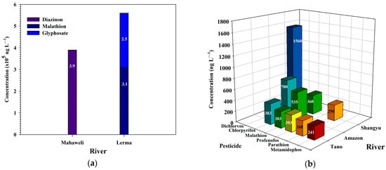 Intermediate concentrations of OPPs were also detected in other rivers around the world, as shown in Figure 6b. For instance, the Shangyu River shows the presence of dichlorvos (1560 ng L−1), malathion (360 ng L−1), and parathion (290 ng L−1) [111]. The Amazon River is contaminated with chlorpyrifos (700 ng L−1) and malathion (535 ng L−1) [124], while the Tano River contains considerable levels of chlorpyrifos (383 ng L−1), malathion (303 ng L−1), profenofos (303 ng L−1), parathion (268 ng L−1), and methamidophos (241 ng L−1) [117].