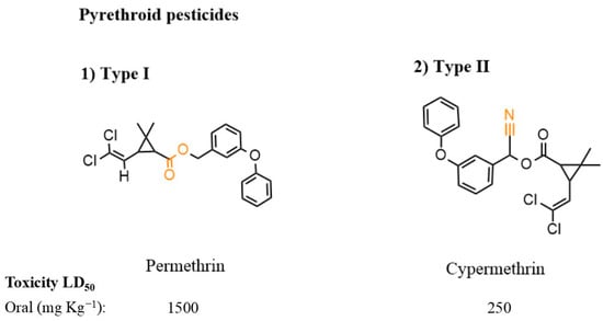 PY pesticides can be classified into two groups: (1) Type I pyrethroid pesticides, which have a basic structure of cyclopropane carboxylic ester (i.e., tetramethrin and permethrin) and (2) Type II pyrethroid pesticides, which contain a cyano group (i.e., cypermethrin, deltamethrin, and fenvalerate) [138,139,140,141] (see Figure 7). Some pyrethroids contain olefinic structures that can form either cis- or trans-isomers [142]. Usually, cis-isomers are more toxic than trans- ones [143].