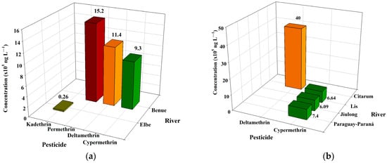 Notably, the Benue River in Nigeria shows the highest concentrations (Figure 8a), with values of 9.3 × 105, 11.4 × 105, and 15.2 × 105 ng L−1 for cypermethrin, deltamethrin, and permethrin, respectively [149]. Interestingly, the Elbe River exhibits a high concentration of kadethrin (0.26 × 105 ng L−1) [144].