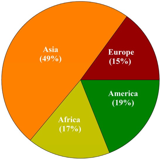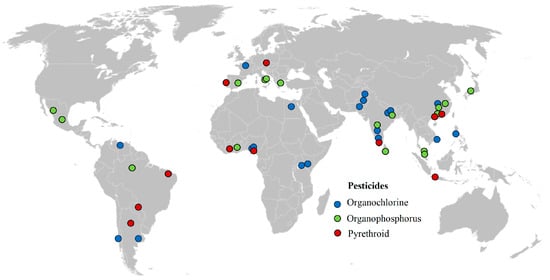 In order to emphasize the impact of pesticide use, it is essential to analyze the geographical distribution of the 47 rivers mentioned in this review. Organochlorine, organophosphorus, and pyrethroid pesticides are found in nearly every region of the globe (see Figure 9). It is important to note that in some regions, the absence of detected pesticides does not mean they are not present. In many cases, pesticides are inadequately monitored, or not monitored at all. Furthermore, these compounds cannot be detected as they enter the hydrological cycle and are transported over long distances.