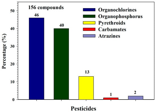 Approximately 2000 active ingredients have been registered as pesticides, categorized into more than 60 chemical groups [59]. Comparative studies between these different groups are essential to obtain a comprehensive understanding of pesticide contamination. Organophosphorus and pyrethroid compounds are among the most commonly used pesticides globally, while organochlorines are highly persistent in the environment [60,61,62]. This research focuses on these three types of pesticides, which are presented in separate sections. In each section, information about their chemical properties, classification, presence in food, and persistence is provided. Additionally, a comparison of pesticide concentration values in rivers around the world with regulated limits is showed. Finally, the effects of pesticides on both the environment and human health are discussed.
