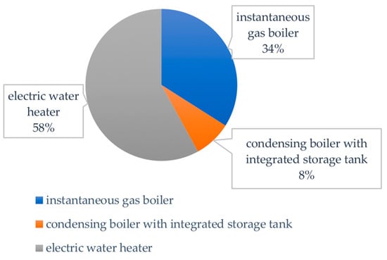 As far as the production of domestic hot water (DHW) is concerned, 58% is entrusted to electric water heaters. The presence of heat pumps, albeit small, is noted in 8% of cases (Figure 7).