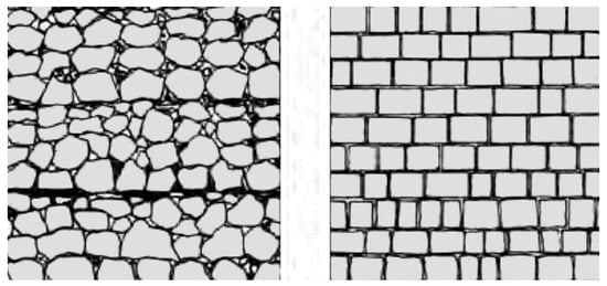 Procida, part of the historic Terra di Lavoro, is geologically notable for its Campanian gray and Neapolitan yellow tuff, which are likely sourced from Roccamonfina or the Campi Flegrei volcanoes. Two primary masonry techniques are used on the island: the “a cantieri” method (on the left in Figure 8), found in older areas, like Terra Murata, featuring rough-hewn stones with horizontal gaps filled with mortar; and the “a blocchetti” method (on the right in Figure 8), which is commonly used in post-17th century buildings in the historic center, using ashlar blocks with minimal mortar joints [60].