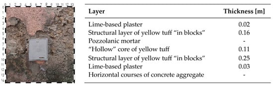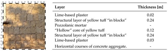 The photographic surveys and the stratigraphy are presented for the first two examples of masonry. For the third and the fourth samples, only the results of the simulations are reported. The tuff masonry on the island is almost exclusively present in the historic centre. In the inland areas and on the more recently developed coastlines, this material is present, but only in non-structural inserts (e.g., boundary walls).