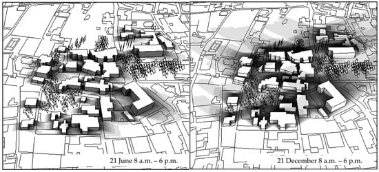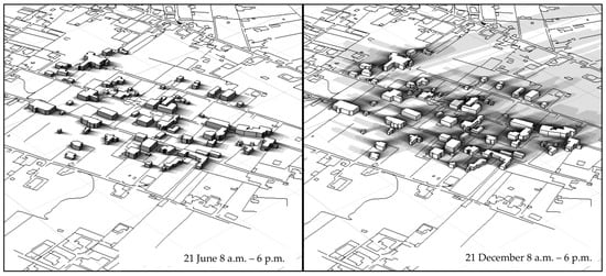The simulation presented in Figure 12 (below) depicts the buildings from the 1960s–1970s, illustrating the area near Silurenza Beach. Here, to the northwest of the island, there is a dispersed development with one-to-two-storey houses surrounded by their own gardens. The vegetation is not of considerable height, since the land is predominantly used for agricultural purposes. The distance between the buildings prevents them from casting shadows on one another.