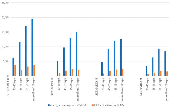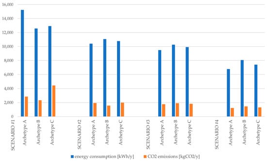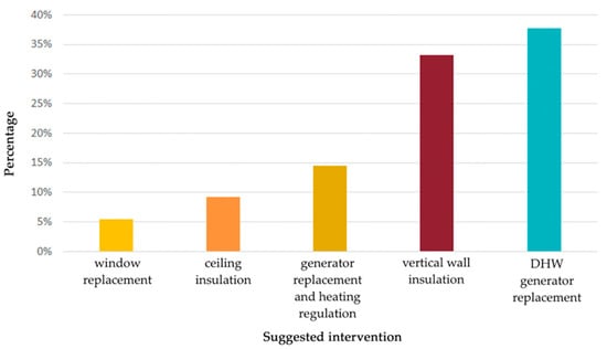 The statistical investigations conducted from the data aggregation by dwelling size and by archetype led to the formulation of intervention scenarios. These were divided into technological–environmental interventions on the building envelope (such as thermal insulation of vertical opaque closures, horizontal opaque closures, vertical transparent closures) and replacement of system components (mainly focused on the installation of heat pumps associated with photovoltaic systems and of solar thermal systems).