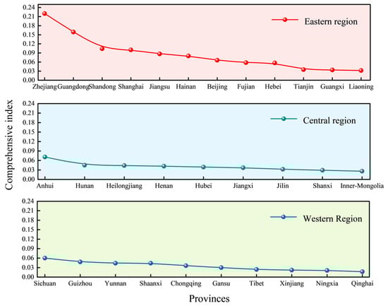 From a regional perspective, 12 out of the 31 provinces are located in the eastern region, 9 in the central region, and 10 in the western region. According to the composite index, the average high-quality development index for health and wellness tourism in the eastern region is 0.0859, indicating the fastest development. Following closely is the central region with an average index of 0.0407, while the western region has an average index of 0.0344, indicating a relatively lower level of development. Thus, the high-quality development levels of health and wellness tourism in the eastern, central, and western regions decrease sequentially (Figure 2).