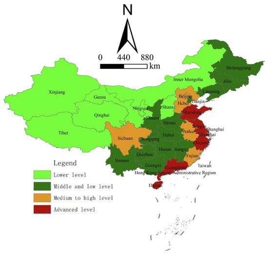 According to the degree of high-quality development of health and wellness tourism, the 31 provinces can be divided into two categories, and ArcGIS 40.8 software was used to create a spatial distribution diagram (Figure 3). As shown in the figure, the six provinces located in eastern China all show high-level development in terms of health and wellness tourism. Among the five medium and high-level provinces, three are located in the east, and one is located in the central region, and one in the western region. Among the 13 middle and low-level provinces, six are located in the center, four are in the west, and three are in the east. Among the seven low-level provinces, five are located in the west and two are located in the center. These findings reflect that the high-quality development trend of health and wellness tourism is gradually increasing from the west to the east.