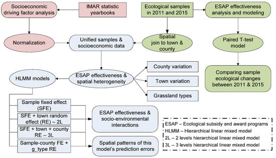 This paper integrates the innovative conceptual frameworks of TSES [5] and social–ecological systems to examine the effectiveness of the Ecological Subsidy and Award Program (ESAP) enacted in 2011. It combines the ecological field observation data with the socioeconomic census data in towns and counties as integrated TSES data to enable an empirical examination of the ESAP. Thus, it contributes to the current literature by filling the gaps in analyzing ecological systems’ responses to the ESAP from the perspectives of socioeconomic driving factors and spatial disparities of climate and environmental characteristics. In addition, the paper develops several hierarchical linear mixed models (HLMMs) to investigate interactions and feedback between ecological, climate, and socioeconomic factors and their joint impacts on ESAP effectiveness. These models can investigate the ESAP’s spatial heterogeneity and explore the meddling effects of integrated socio-environmental interactions on ESAP effectiveness. The novelty of our new methods is to examine ESAP effectiveness in the IMAR from the ecosystem’s biological responses, underlying socioeconomic influences and their spatial disparities. Section 2 discusses the study area, the data, and the analytical method; Section 3 presents the analysis results; Section 4 discusses the findings and policy implications; and the conclusions are summarized in the last part.
