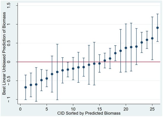 The overall average biomass (across counties) is estimated as 83.87. The biomass at county j is calculated as 83.87 + , where is the county residual stated in Table 3. When a county has a µoj > 0, its biomass exceeds the average, while µoj < 0 for a below-average county. For example, Sonid Right Banner (cid = 2206) had an estimated residual of −46.71, which ranked it first from the bottom. In the case of this county, we estimate a mean biomass of 83.87 − 46.71 = 37.16, the lowest biomass in Inner Mongolia, China. Sonid Right Banner is positioned in the western sector of Xilingol grassland, and it has been rated as “very serious alerts” or “serious alerts” because of its severely deteriorated ecosystem security [34]. On the other hand, the highest biomass occurs in Horqin Left Back Banner. Its biomass is estimated as 83.87 + 62.67 = 146.54. This county is located on the eastern border of Inner Mongolia, adjacent to China’s Northeast Plain. It has a semi-humid climate and vast grasslands. With the ecological compensation policy, this county reversed the trend of ecological deterioration, and its grasslands were recovering [35]. The biomass rankings over 26 counties are graphed in Figure 3. In combination with Table 5, they show how spatial patterns of sample biomass were distributed over Inner Mongolia.