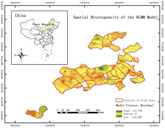 Furthermore, we delved into the spatial disparities in the influence of ecological and socioeconomic determinants on grassland productivity, scrutinizing the deviations in predicted biomass across the 392 sampled locations. Spatial interpolation is used to derive the continuous surface across 392 samples over 26 counties using the sample residuals from the HLMM model. Figure 4 shows the spatial patterns of the performance of the added county-level explanatory variables with the g_type random effects model. The residuals are medium to low in the areas where the dominant grass types are temperate steppe and temperate desert steppe, indicating that the HLMM overestimates the biomass. The GLMM tends to underestimate the lowland and temperate grassland biomass.