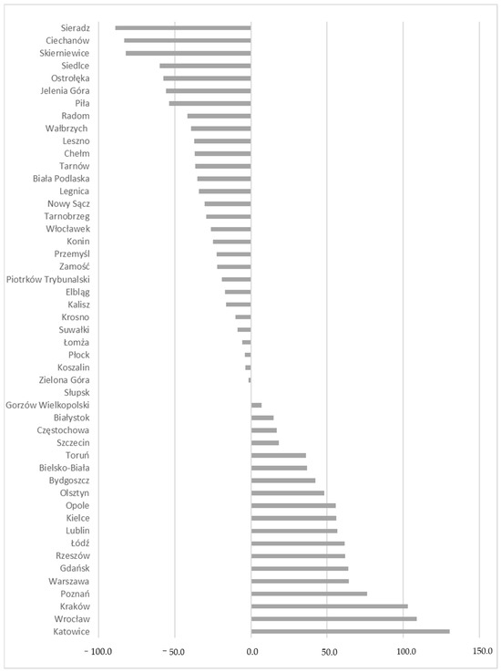 The group of cities whose central functions became less important (correcting for a city’s population) between 1998 and 2019 includes only those that lost their role as a regional capital. These former capitals can be generally described as large towns with a population below 100 thousand. The exceptions from this rule are Radom (210 thou.) and Wałbrzych (110 thou.), which have both faced major problems associated with the process of economic transformation and the collapse of local industry (coal mining in Wałbrzych and arms production in Radom) [42,43].