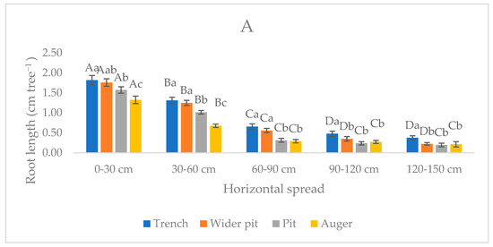 For horizontal distribution, the root length observed at 30, 60, 90, 120, and 150 cm away from the trunk was varied largely for planting pits adapted under the shallow gravelly land situation. At 0–30 and 30–60 cm places, the trench and wider pit produced more lengthier roots compared to pit and auger other pits. The pit method produced significantly more root length compared to the auger method at this interval, whereas both of these methods produced lower and similar lengthier roots, while the trench and wider pit produced roots with greater length. At 90–120 and 120–150 cm intervals away from the trees, only the trench planting produced longer roots (Figure 4A).