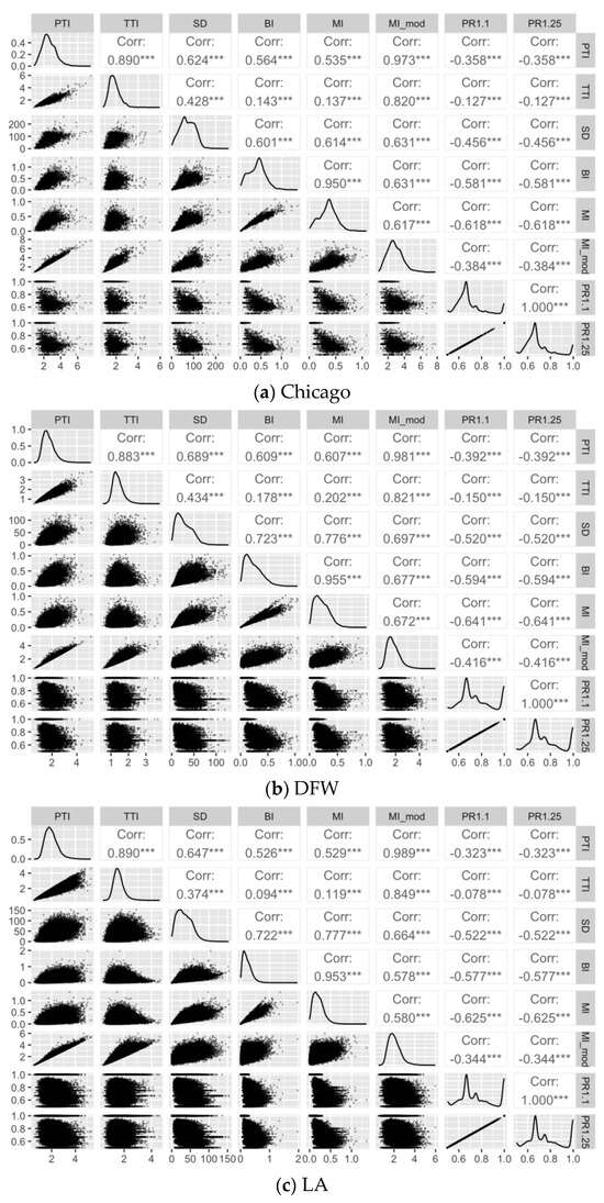 Pairwise correlation matrix plot between SD, TTI, PTI, PR10, PR25, MI, and MI_mod of three metropolitan areas: (a) Chicago; (b) DFW; (c) LA. Note: *** p < 0.001 indicate levels of statistical significance.