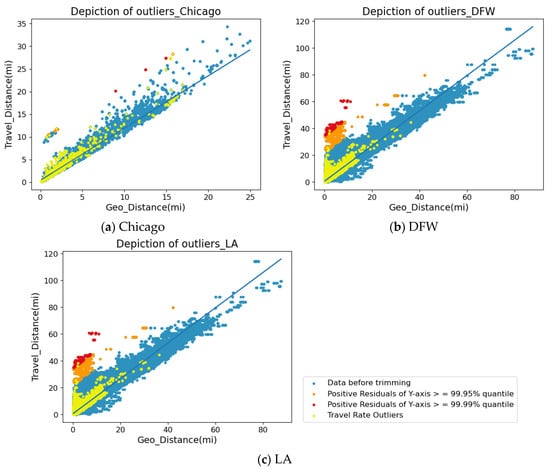 Step 4: Difference in geodesic distance and travel distance cleaning—since a trip’s path rarely follows a straight path between the origin and destination, geodesic distances should be less than or equal to trip distances. However, for TNC data, geodesic distances are calculated between the centroids of the pick-up and drop-off locations, not the actual origin and destination of the trips. As a result, trip distances might be higher or lower than geodesic distances. Nonetheless, for longer trips, it is more likely that the trip’s distance will be higher than the geodesic distance. Hence, two filters are applied to eliminate the outliers: (a) trips above the regression line are identified, and the top 0.05% of these trips are treated as outliers; (b) points with travel distance at least 10 times greater than their corresponding geodesic distance are excluded.