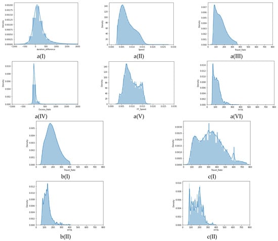 (a) Distribution of travel time-related variables in DFW: (I,IV) travel time duration difference (second) and excess rate (m/s); (II,V) travel speed (m/s) and free-flow travel speed (m/s); (III,VI) travel rate (s/m) and free-flow travel rate (s/m). (b) Distribution of travel time-related variables in Chicago: (I,II) travel rate (s/m) and free-flow travel rate (s/m). (c) Distribution of travel time-related variables in LA: (I,II) travel rate (s/m) and free-flow travel rate (s/m).