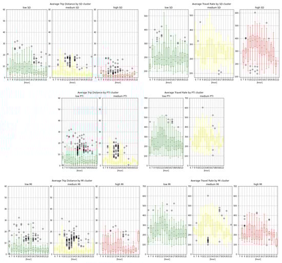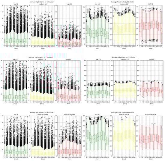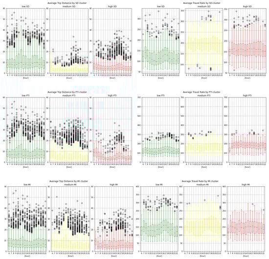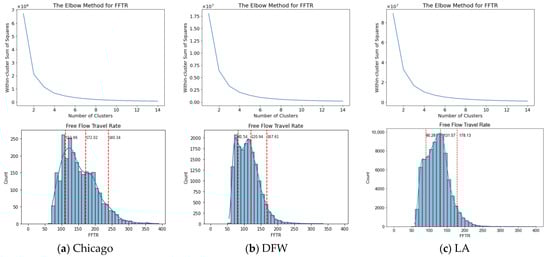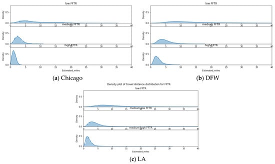 Figure 5 illustrates the distribution of estimated travel distances for each cluster. It is observed that across all the cities, the cluster with the lowest FFTR includes trips with diverse distances, whereas the clusters with medium- and high-FFTR values primarily comprise much shorter trips. This phenomenon can be attributed to the fact that short trips are more inclined to use arterial roads within the city [], where congestion occurs more frequently, and traffic signal cycles may have varying effects on waiting time variance. Conversely, longer trips are more common in suburban areas and freeways. Additionally, the overhead time per mile, which includes the wait time, pick-up time, and drop-off time of passengers, tends to be higher for shorter trips compared to longer trips []. This distinction contributes to the clustering of shorter trips into the medium- and high-FFTR clusters. Moreover, a comparative analysis among the three reveals that Chicago exhibits a relatively slower pace and a longer tail in its FFTR distribution. This could be attributed to the presence of multiple city centers, such as business areas, and lower-density neighborhoods in Chicago. Moreover, the occurrence of long intercity trips between airports and business areas further influences the FFTR distribution in the city.