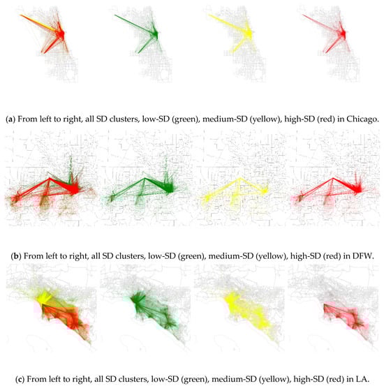 Spatial distribution of all SD clusters, low-SD (green), medium-SD (yellow), high-SD (red) by OD pairs of (a) Chicago, (b) DFW, and (c) LA.