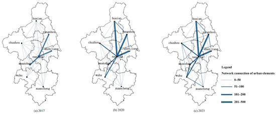 Evolution of the distribution pattern of element connections between cities in the Nanjing metropolitan area.