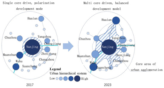 In addition, studies have pointed out that the financial policies of various cities within the metropolitan area should be coordinated, and investment scales in major regional infrastructure projects and livelihood development projects should be actively carried out to continue enhancing Nanjing’s central city function [55]. Other cities within the metropolitan area must seize their own resource endowment characteristics, gradually improve their social security system, increase resident income, regulate market order, create a good consumption environment, guide the diffusion and inflow of high-end consumption demand in Nanjing to surrounding cities, and drive the rational division of labour and cooperation among cities [50]. In addition, there are functional connections between cities at different levels within the metropolitan area, and the functional radiation ranges of the central and sub-central cities overlap with each other, forming a “core edge” spatial connection classification area. From Figure 7, as the scale of subcentral cities in urban agglomerations continues to increase, their functional radiation range also expands, thus compressing the functional scope of the central cities. The peripheral areas of urban agglomerations are more susceptible to the elemental connections of the subcentral regions, and the entire urban agglomeration ultimately forms a networked hierarchical spatial structure.