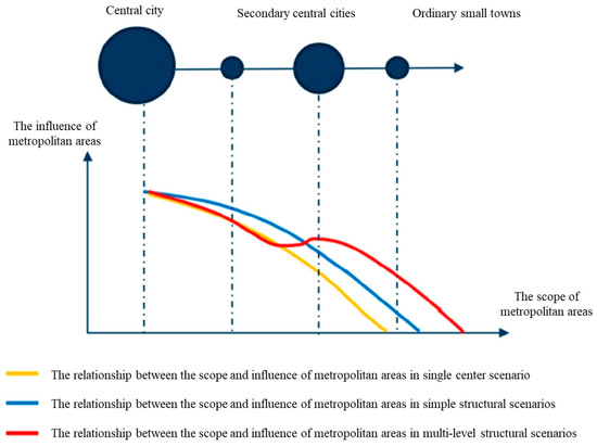 In Figure 6, the large circle represents the central city of the metropolitan area, the middle circle represents the potential secondary central cities within the region, and the small circle represents general small towns. Starting from the central city, taking a certain radius direction and following a simple distance attenuation rule, we drew a graph of the relationship between the influence of urban agglomerations and their spatial scope. Due to the emergence of secondary centres, the influence of urban agglomerations has rebounded far from the central city. In the same external environment, urban agglomerations with multicentre networked structures have a larger spatial range of functional radiation.