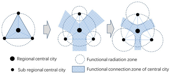 The evolution relationship of functional radiation ranges between central and sub-central cities in urban agglomerations.