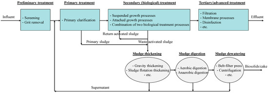 Wastewater and sludge processing trains and steps with some related/associated processes in municipal wastewater treatment plants.