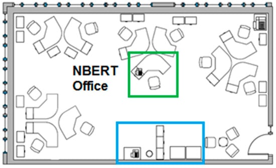 Image illustrating the layout of the NBERT office; the blue box represents the kitchenette area, and the green box represents an occupant’s workstation.