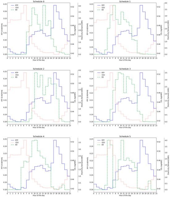 Schedule 4 and schedule 5 were developed to discern the willingness of the building occupants to observe unusual working hours to reduce electricity costs. Figure 3 displays the electricity demand of all 6 schedules along with the corresponding price and CO2 intensity of the electricity.