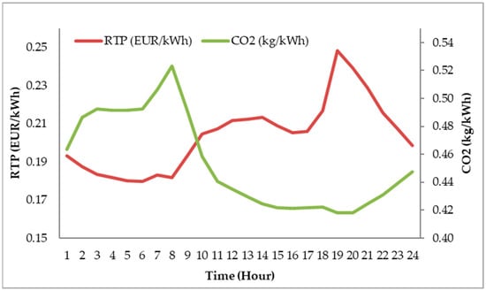 The decision support tool for renewable energy microgrids (DSTREM) [21] was employed to simulate REµG electricity output, monetary income and associated CO2 emissions. The DSTREM is a tool that enables the users of buildings with an integrated REμG and smart grid connections to compare electricity tariffs, FITs, monetary income and associated CO2 emissions under different renewable energy system configurations through the use of control logic. Irish national grid data for the real-time pricing electricity tariff (RTPET), real-time electricity CO2 emissions (kg/kWh) and three stationary FIT structures for 2013 were used as inputs for the DSTREM under four different REµG configurations, namely no REµG, PV, wind and PV + wind. Real-time electricity CO2 emissions and demand on the national electricity grid data were provided by Eirgrid [22]. The RTPET represents a dynamic pricing structure based on the demand of the national smart grid, which varies depending on the hour of the day, day of the week and month of the year. The hourly average RTPET for the year 2013 was calculated and utilized. Figure 4 represents the hourly average dynamic RTP (EUR/kWh) and CO2 (kg/kWh) for 2013. The design of the RTPET is described in more detail in previous studies [4,21].