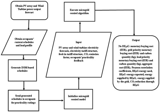 - In summary: For the load priority control, there were 10 occupants, six schedules (one base schedule plus five DSM schedules), three REµG configurations, three FITs and two electricity tariff structures (10 × 6 × 3 × 3 × 2) = 1080 simulations. For the grid priority control, we had 10 occupants, six schedules, three REµG configurations, two FITs and two electricity tariff structures (10 × 6 × 3 × 2 × 2) = 720 simulations. For the no REµG configuration, we had 10 occupants, six schedules, no REµG configurations, no FITs and two electricity tariff structures (10 × 6 × 2) = 120 simulations. The overall number of simulations was 1920. Each of these simulations was applied to the five workday periods explained in Section 2.1 and Section 2.2.