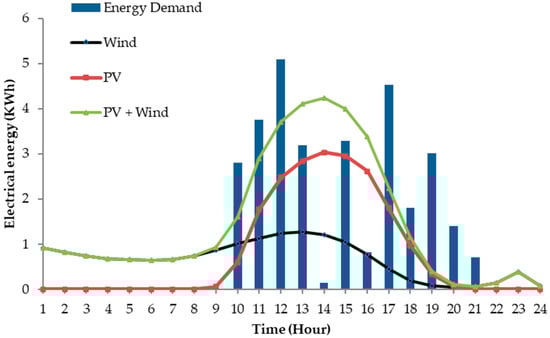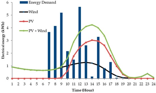 The results of the REµG energy output were averaged across the months of January, February, March, April, May, July and September for 2013. The average REµG energy outputs were 35.10 kWh, 54.47 kWh and 89.58 kWh for PV, wind and PV + wind, respectively. Figure 7 shows the mean hourly PV, wind turbine and PV + wind turbine energy outputs along with the corresponding hourly electricity demand of occupant A averaged across the five-day work week for schedule 0. Figure 8 shows the same data for schedule 1. Similar figures for schedules 2 to 5 are presented in Appendix B Figure A2, Figure A3, Figure A4 and Figure A5, and a supporting dataset has been included in the Supplementary Materials.