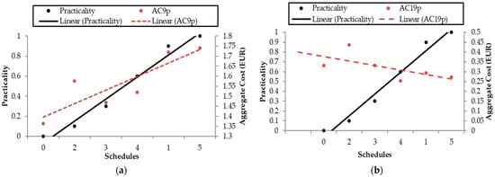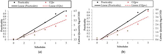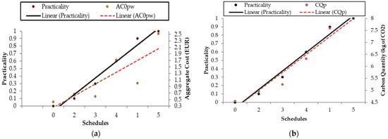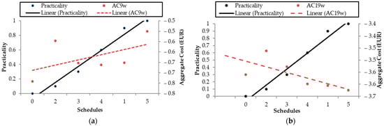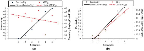 For example, a strong positive correlation between the MBC and practicality implies that as cost savings achieved by DSM schedules increase, the practicality for an office occupant reduces. The MBC, CQ and AC are expressed in Equations (2), (3) and (9), respectively for each DSM schedule at each analyzed microgrid control and FIT.