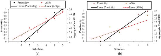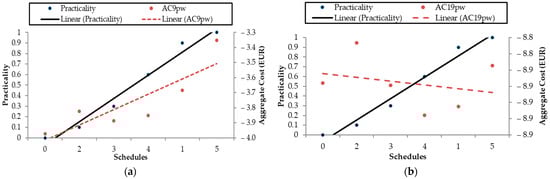 A survey of the practicality of the generated price-based DSM schedules was taken using the occupants of the NBERT building. The occupants rated the practicality of the five price-based DSM schedules on a scale of 0 (highly practical) to 1 (highly impractical) through a blind survey (i.e., without access to the cost implications of each schedule presented to them). The results from the survey were used to assess the relationship between DSM schedule practicality and a range of associated energy costs using Pearson correlation coefficients (r). The Pearson correlation coefficient is an established method of evaluating the strength of relationships between independent and dependent variables and has been deployed in several studies relating to the impacts of DSM [15,20,26]. The analyzed energy costs included the monetary buying cost (MBC), carbon quantity (CQ), and aggregate cost (AC), which are described as follows: