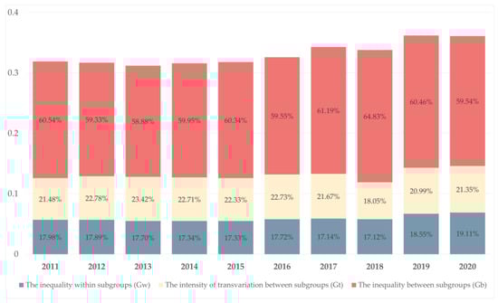 4.2. Decomposition of Dagum’s Gini Coefficient for Actual GDE