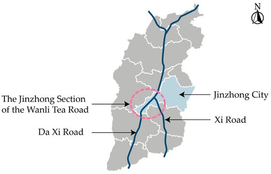The Wanli Tea Road is an international commercial channel dominated by Shanxi Merchants and developed in the Qing Dynasty [47,48]. Shanxi Province, China, as the birthplace of the Shanxi Merchants, has two main tea roads, Xi Road and Da Xi Road, which intersect in Jinzhong City and then extend northward in a “人” shape [49] (Figure 1). Jinzhong City is an important hub of the Wanli Tea Road in Shanxi Province, which has rich historical and cultural resources and important research value. The Jinzhong section of the Wanli Tea Road in this paper refers to the overall route formed by relatively regular and obvious tea road routes within the jurisdiction of Jinzhong City (Figure 2).