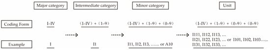 Based on the “N-level coding” theory, this paper divides the identified landscape genes into four levels: major categories, intermediate categories, minor categories, and units. The coding uses a combination of Roman numerals and Arabic numerals, with each level adding a new digit from “major categories” to “units”. Specifically, Roman numerals represent major categories, while intermediate, minor categories, and units use Arabic numerals. For minor categories that cannot be further subdivided, the Arabic numeral “0” is used, while other categories are coded with Arabic numerals “1–9”. This systematic and intuitive coding approach establishes a hierarchical landscape gene model (Figure 3), laying a solid foundation for the systematic analysis of landscape genes.