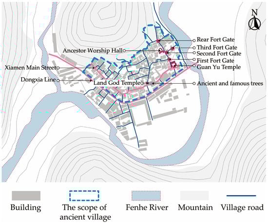 According to the results of landscape gene identification in Xiamen Village and the above methods, the landscape gene information chain was constructed, and an example diagram was formed (Figure 5). The landscape gene information element refers to the excellent historical and cultural information of the village, which covers the core cultural content of the village, including five aspects: belief culture, clan culture, historical memories, traditional techniques, and cultural activities. The landscape gene information points are the specific material manifestations of landscape gene information elements, showcasing the rich historical and cultural connotations of Xiamen Village, mainly including two aspects: traditional building and environmental elements. The landscape gene information corridor is a transportation corridor that connects various landscape gene information points in the village and is also an important scenic tour route. The main corridor is the Dongxia Line and the Xiamen Main Street, which pass through the village from east to west, and the secondary corridor is the roadway in the village, which together form a branch-like traffic space.