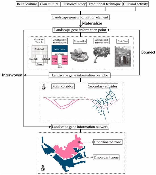 The landscape gene information chain is an innovative theory that is condensed and applied on the basis of landscape gene theory. It is a stable spatial structure formed by the interaction of different landscape genes in traditional villages [40]. The core parts of the landscape gene information chain are mainly landscape gene information elements, landscape gene information points, landscape gene information corridors, and landscape gene information networks [45].