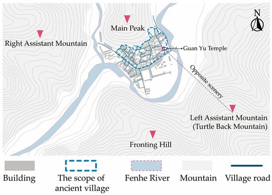 In terms of environmental elements, from the perspective of geomancy, Xiamen Village is near the residual vein of Lvliang Mountain to the north, which is the Main Peak of the village. The villagers also call this Main Peak the Dragon Head Hill, which is used to symbolize “The Battle of Que Shu Valley” in the Tang Dynasty. On the southeast side is Left Assistant Mountain, which is called Turtle Back Mountain by villagers because it looks like a turtle. It is opposite to Guan Yu Temple, forming a unique combination of nature and building (Figure 7). The mountain on the south side adjacent to the village is the Fronting Hill, and the one on the west side is the Right Assistant Mountain. The Fenhe River tributaries pass through the mountain and the south side of the village. The village as a whole presents a natural landscape environment surrounded by mountains and rivers, and its geomantic pattern is coordinated and unified, which enhances the overall ecological harmony and reflects the traditional philosophical thought of the unity of heaven and man.
