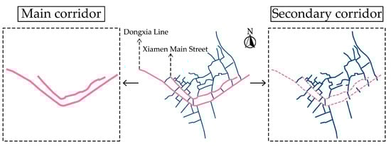 In general, the primary and secondary landscape gene information corridors of Xiamen Village are integrated with each other and connected organically (Figure 9). The main corridor extends along the east-west direction, showing a relatively clear linear trend, while the secondary corridor bifurcates from the main corridor, showing a flexible and changeable branch structure. The overall level is distinct, and the layout is compact. The linear “trunk” and winding “branches” together constitute the “branch-like” street traffic space. This “branch-like” landscape gene information corridor is neither a simple grid structure nor a regular linear structure, but shows a high degree of nonlinearity and organics, with complex and diversified characteristics. Furthermore, this “branch-like” organization better adapts to the terrain characteristics of the slope at the foot of Xiamen Village. Based on the main corridor, the secondary corridor naturally extends with the relief of the terrain, which not only makes the traffic space more reasonable, but also enhances the accessibility of each landscape gene information point of the village.
