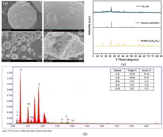 Results of fly ash characterization: (a) SEM: 500 nm, (b) SEM: 500 nm, (c) SEM: 10 μm, (d) SEM: 10 μm, (e) XRD, and (f) EDS.