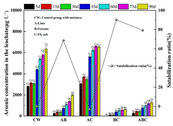 In a soil cultivation experiment, the ferrous fly ash treatment group (BC) demonstrated a total As concentration of 2884.47 mg·kg−1, with a commendable stabilization efficiency of 90.43% over a 90-day period.