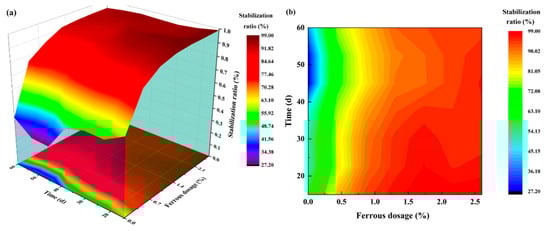 Figure 3 shows the experimental results of the effects of different concentrations of the activation factor on the stabilization of soil As. The results indicate that a concentration of 2% (w/w) was the optimal dosage with an Fe2+ concentration of 0.4% (w/w), yielding the best stabilization efficiency. Figure 3a shows the 3D mapping surface plot. In the ferrous fly ash treatment group with a total As concentration of 2884.47 mg·kg−1, as the concentration of ferrous salt increased, the stabilization efficiency gradually increased and eventually stabilized. At a dosage of 2% (w/w), the stabilization efficiency reached a maximum of 90.43% and remained above 90% throughout the curing period, indicating that this dosage meets the requirement for stabilizing As in soil. Figure 3b is a contour plot. When moving along the x-axis to the right, under the condition of a fixed fly ash matrix quantity, the stabilization efficiency improves as the concentration of the activation factor increases. The activation factor with a dosage of 0.5% (w/w) exhibited the highest rate of increase in stabilization efficiency, achieving an improvement of 201.93% in the efficiency of fly ash stabilization of As. At this dosage, the Fe/As ratio was 5:2, which is consistent with the findings of Moore [39], and the stabilization efficiency remained above 75% throughout the curing period. When moving upward along the y-axis, the stabilization period gradually extends; however, there was a slight decrease in the stabilization efficiency, with the most significant fluctuation occurring on the day 45.